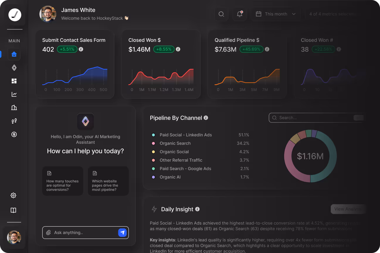 While having a GTM or revenue operations resource can help streamline implementation, HockeyStack is built as a fully self-serve GTM AI platform and doesn’t require any coding. Our AI agents, Odin and Nova, make it easy to analyze touchpoint data and surface next best actions—no technical knowledge needed.