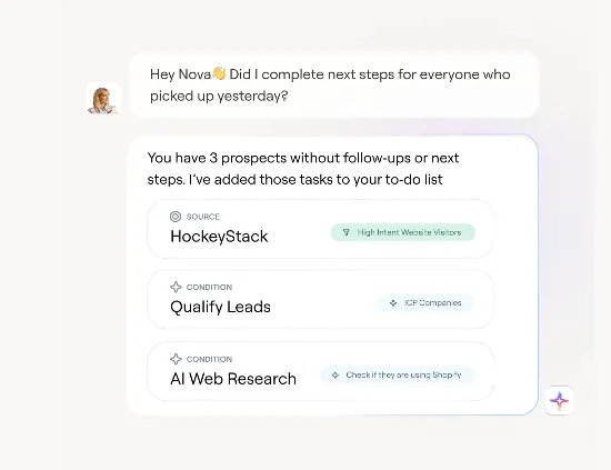 PRO TIP: HockeyStack's Nova AI sales assistant “lives” inside your CRM and can instantly generate personalized outreach based on a prospect's entire buyer journey. Nova pulls from CRM data, call transcripts, emails, and intent signals to write relevant sequences on demand. You can ask Nova, "What should I send to Pied Piper based on their recent activity?" and get custom messages that reference their specific research behavior and funnel stage.
