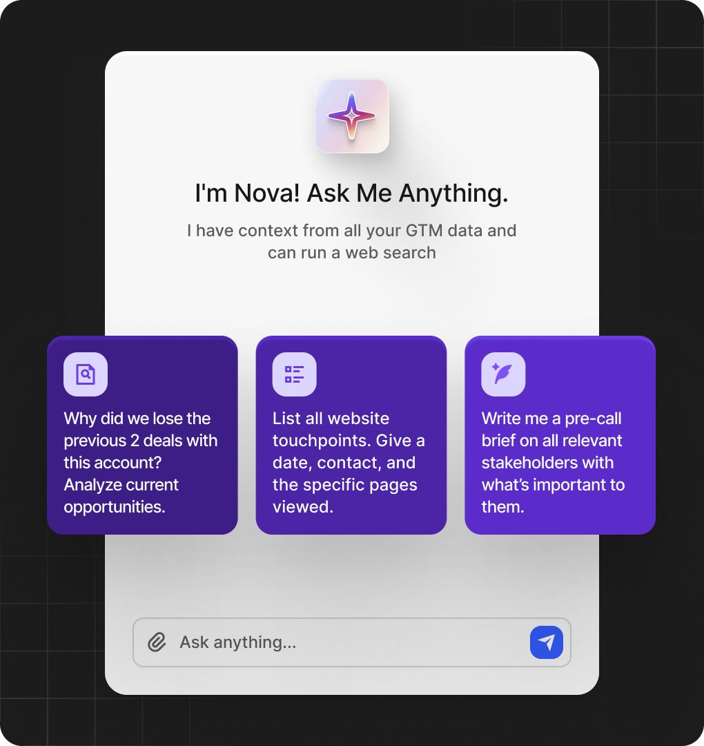 Nova connects your CRM data, calls, emails, and web signals to answer questions, draft outreach, and prep reps for every meeting.