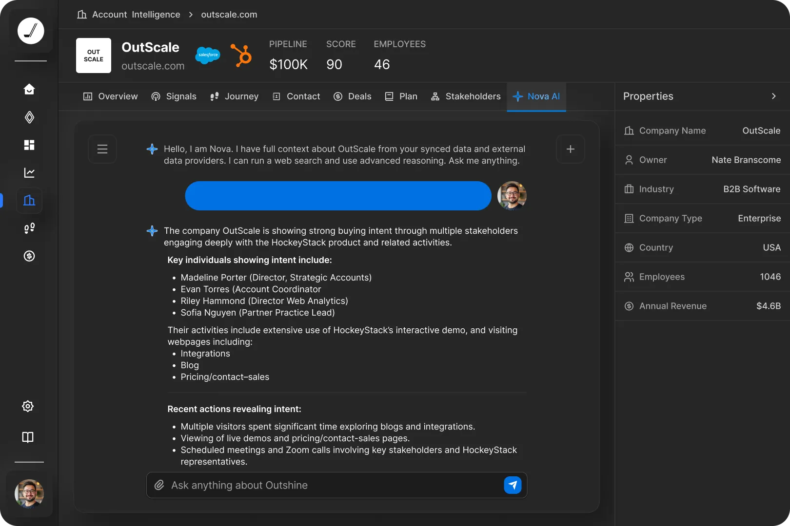 Nova connects your CRM data, calls, emails, and web signals to answer questions, draft outreach, and prep reps for every meeting.