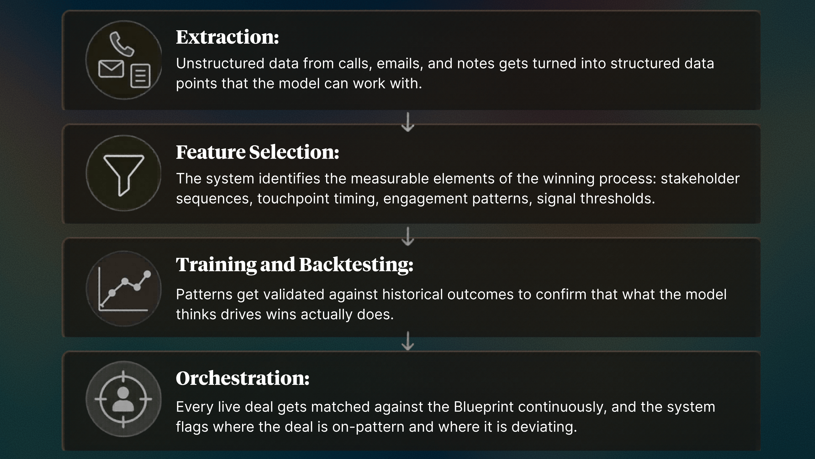 The Blueprint sits on top of the event chain and reverse-engineers the patterns that drive outcomes. It is not an LLM with a prompt. It is a machine learning pipeline designed specifically for revenue data.