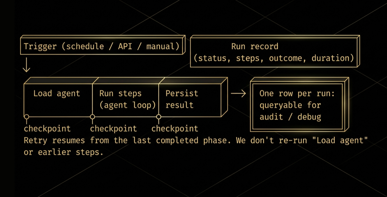 Every agent run is executed as a durable workflow, not a one-shot request. We break each run into phases, checkpoint after each one, and write a run record so you can see exactly what happened.