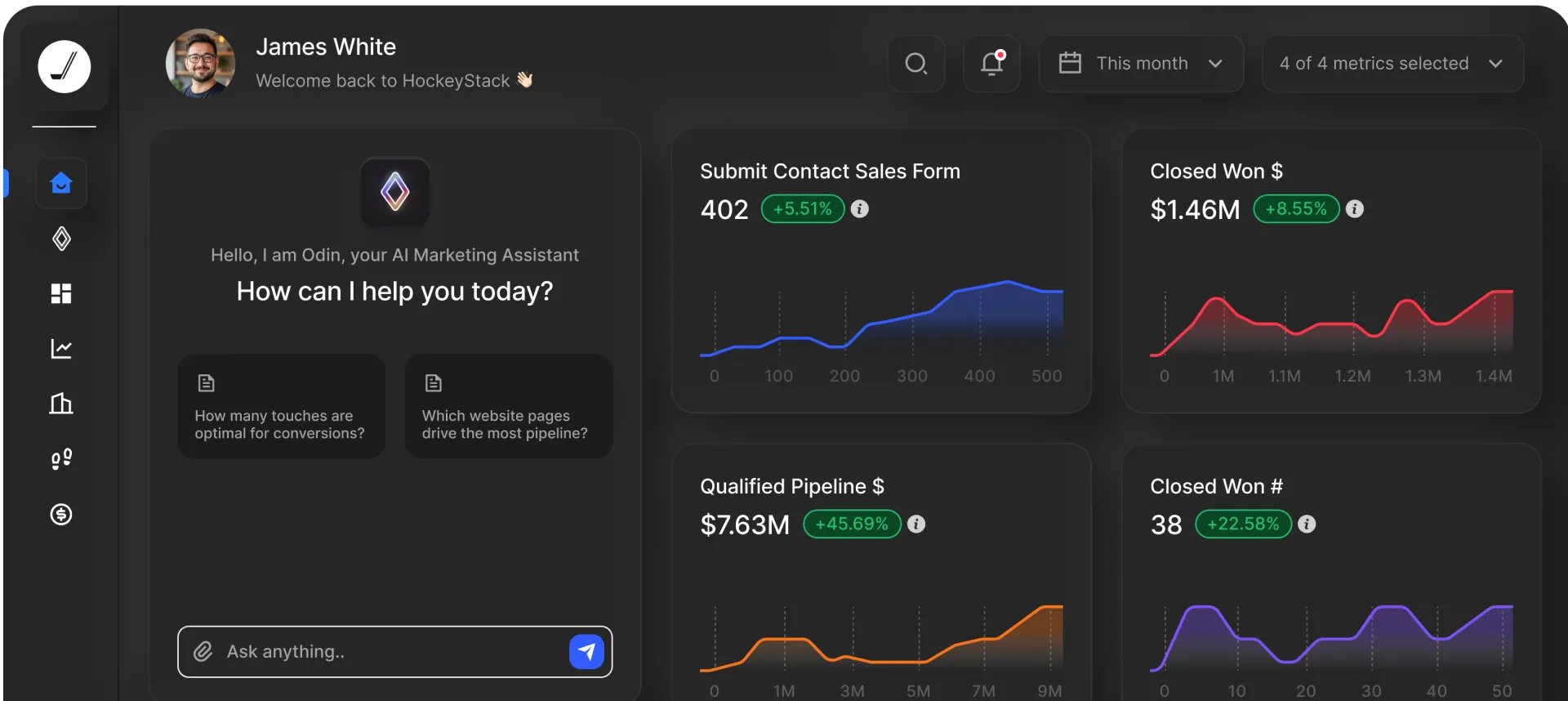 HockeyStack's Odin AI turns attribution insights into recommendations. Instead of staring at dashboards wondering what to do next, marketing and revenue teams get specific guidance: "Increase investment in content syndication for mid-market accounts" or "Your enterprise deals stall at the security review stage—focus enablement there." This translation from data to action separates attribution systems that drive results from those that just produce reports.