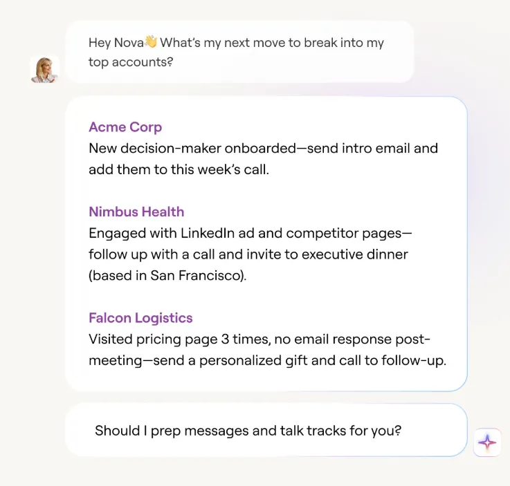 - Nova AI automates your entire GTM execution: Nova researches accounts, scores leads based on product usage, and runs workflows across your tools automatically. When someone hits usage limits or explores premium features, Nova enriches their data, finds the right contacts, and triggers personalized outreach.