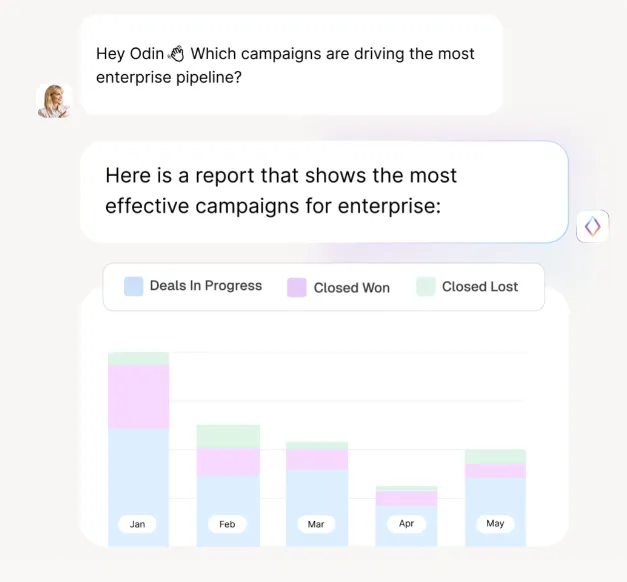 - Odin AI answers your revenue questions instantly in plain English: Ask which campaigns drive enterprise accounts or why trial conversions dipped last month — Odin analyzes your entire funnel and brings visual insights in seconds. No more waiting for custom reports or piecing together data from multiple dashboards to understand what's happening in your SaaS metrics.