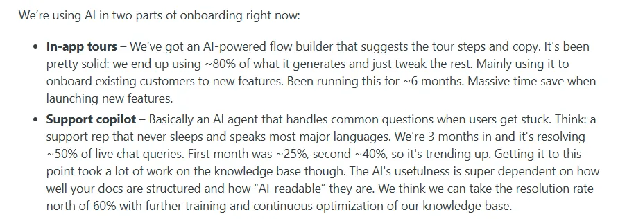 The system knows when someone's stuck before they know it themselves and serves up the exact help they need. One Reddit user shared an interesting approach on how their team is using AI for onboarding: