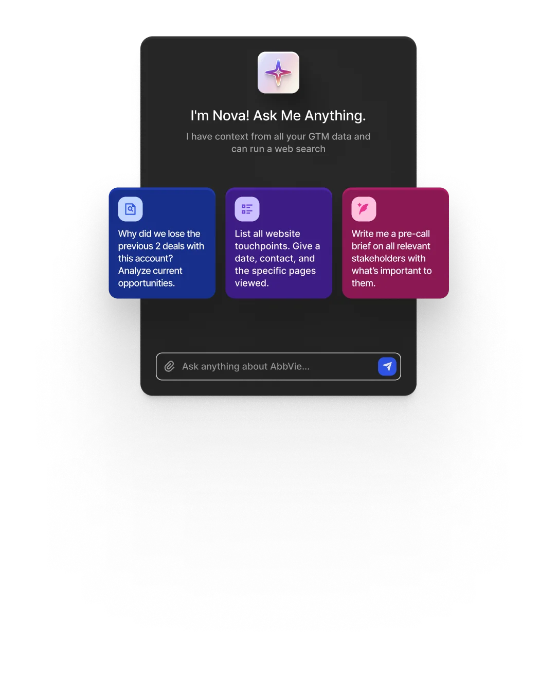 - Nova executes on those insights: It writes personalized outreach, prioritizes accounts for your reps, and routes leads to the right people. The AI handles the heavy lifting so your team can focus on closing.