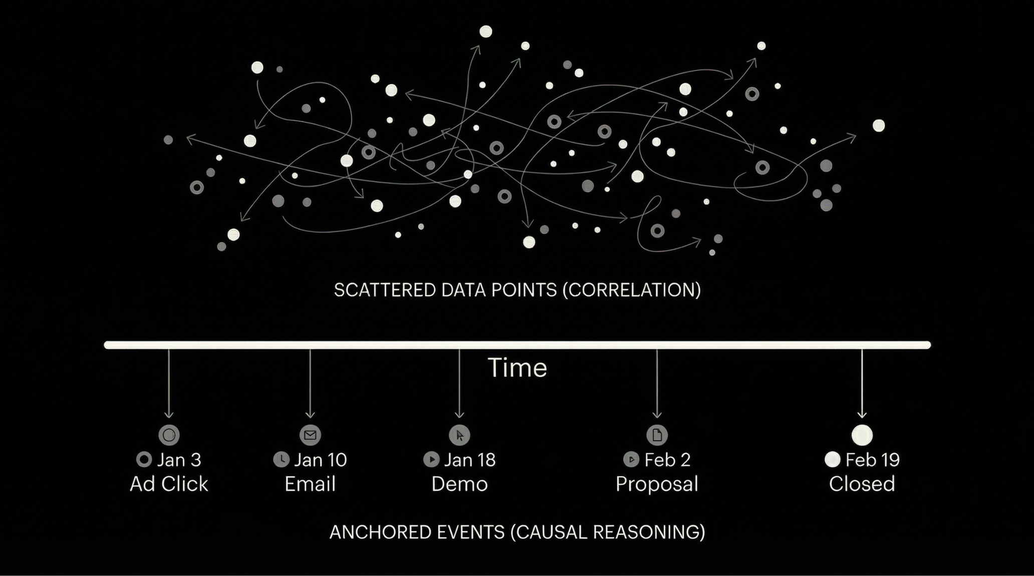 Unlike simpler models, it also looks at the intermediate steps, including interactions during lead nurturing, qualification, and informed decision-making.