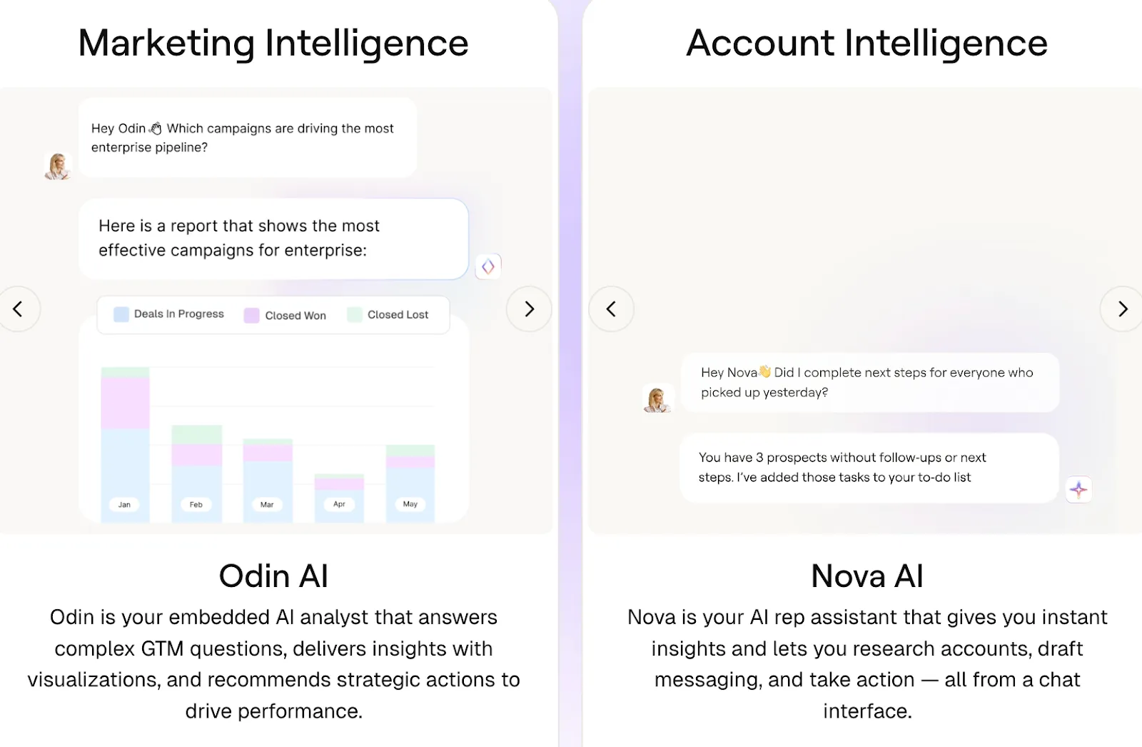 Odin is your on-demand revenue analyst. Reps can ask questions in plain English, like "Which enterprise accounts are showing buying signals?" or "What messaging worked for similar deals?" and get instant answers with visual breakdowns.