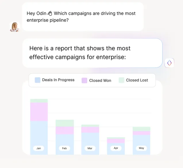 You can ask Odin to find out the top performing campaigns for enterprise pipeline, which content type you should create more next quarter, or to prepare your doc for your next board meeting.