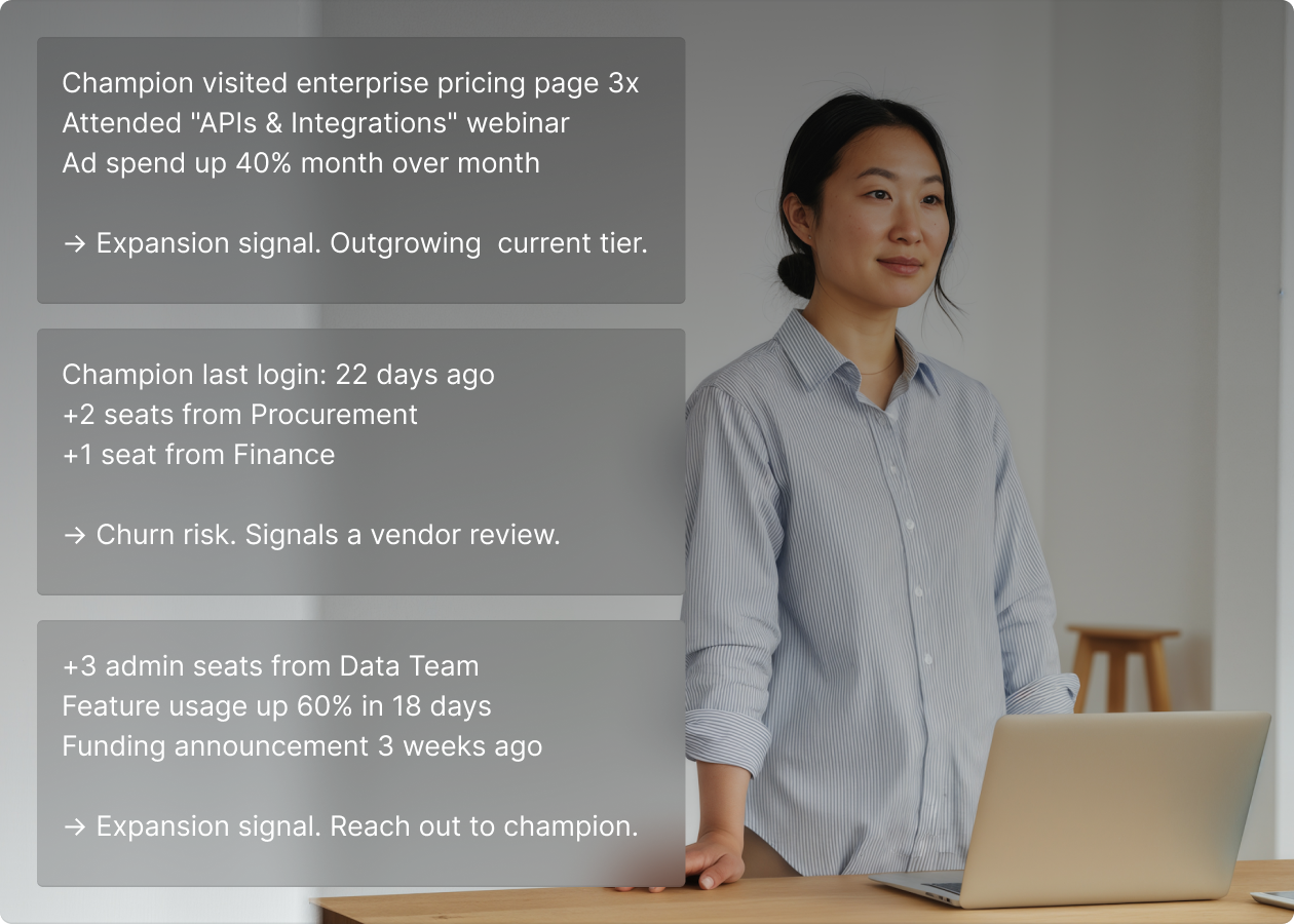 Expansion conversations shouldn’t be reactive. HockeyStack surfaces the signals that predict growth and puts the right play in front of your team before renewal.