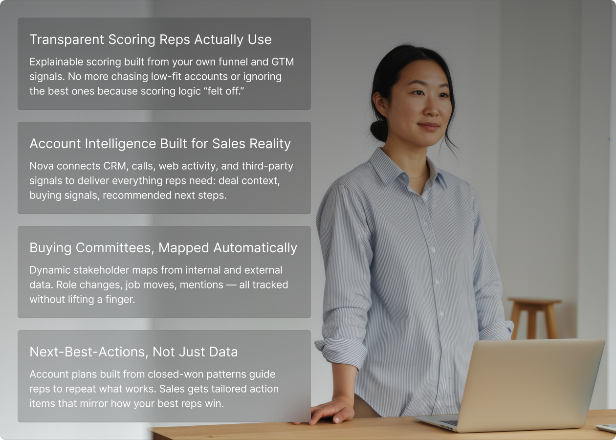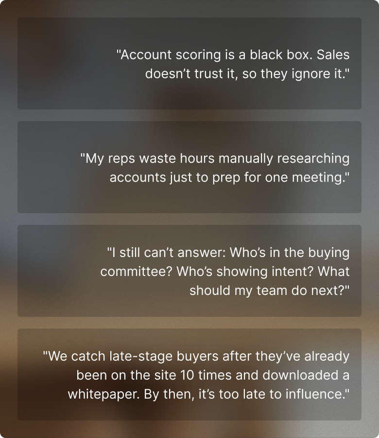 Combine first- and third-party data with customizable, explainable scoring models built for your GTM strategy. See who’s high intent — and why.