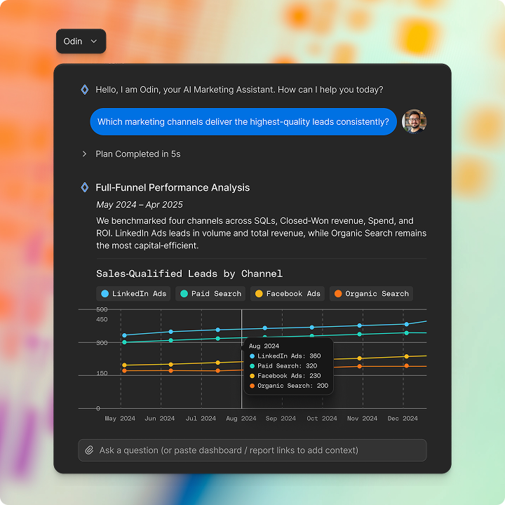 Odin provides marketing insights and reasons. Ask, view visuals, and get recommendations.