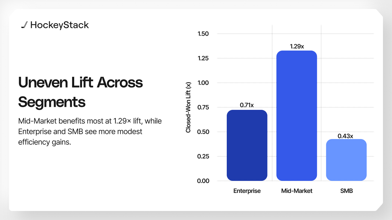 Among all company sizes, mid-market sees the most pronounced incremental lift, with closed-won likelihood nearly tripling. Mid-market buyers behave like classic high-intent searchers: