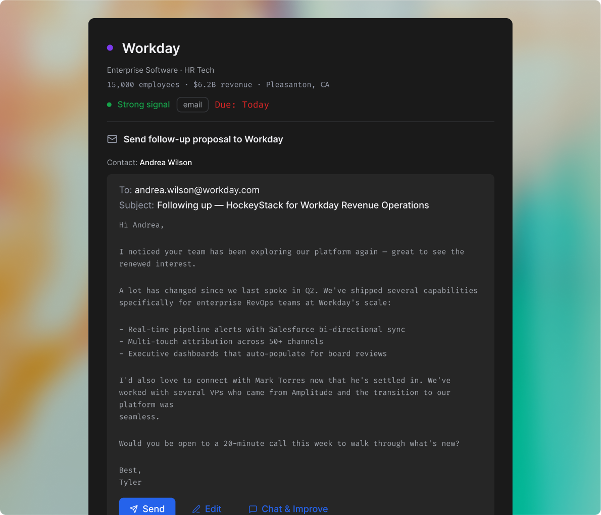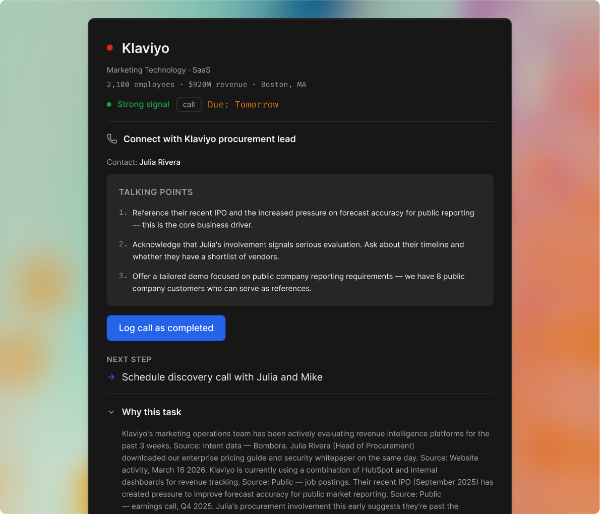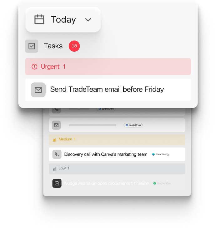 Revenue agents automatically generate prioritized, personalized outreach tasks across every channel, every day.