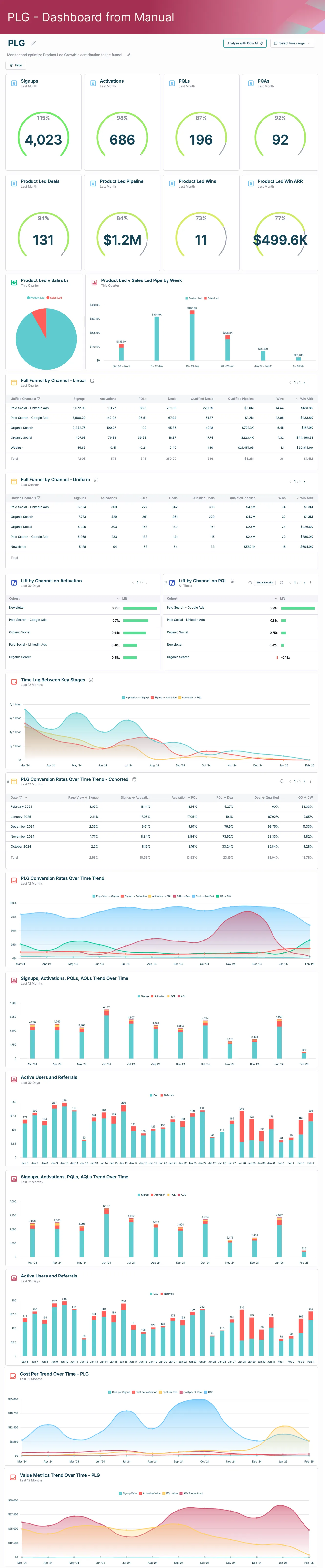 - Watch for signs of inefficiency like increases in TOFU cost pers (signup, activation) over time if your downfunnel cost pers aren't decreasing (PQL, deal, win).
