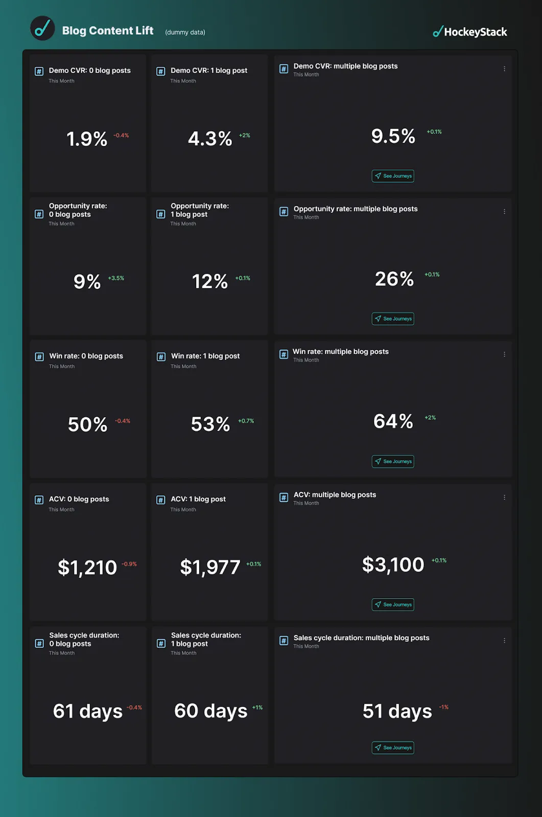 For example, does reading one blog post increase demo conversions? Does reading 2 blog posts increase annual contract value? Or does reading 8 blog posts increase win rates? And by how much? This report will tell you.