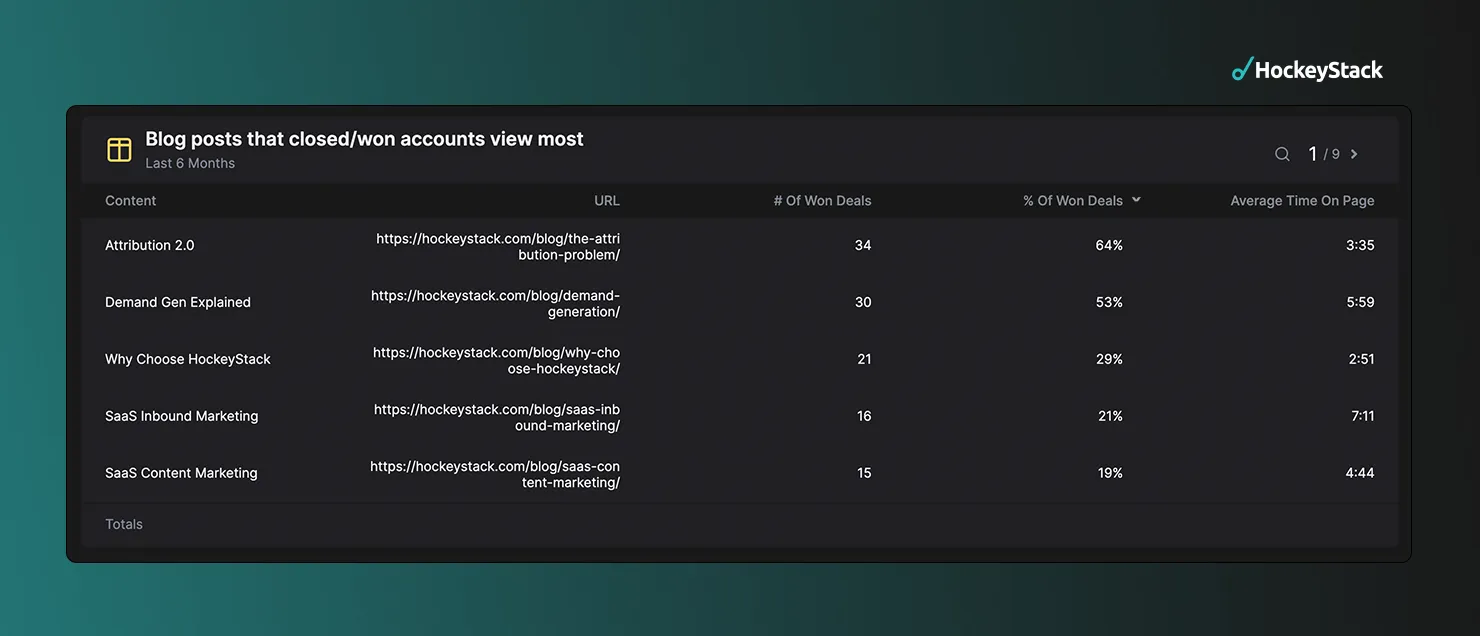 In HockeyStack, you can build a table that features a list of the top blog posts viewed most by closed/won accounts, complete with average time on page and the percentage of accounts who engaged with them before the demo.
