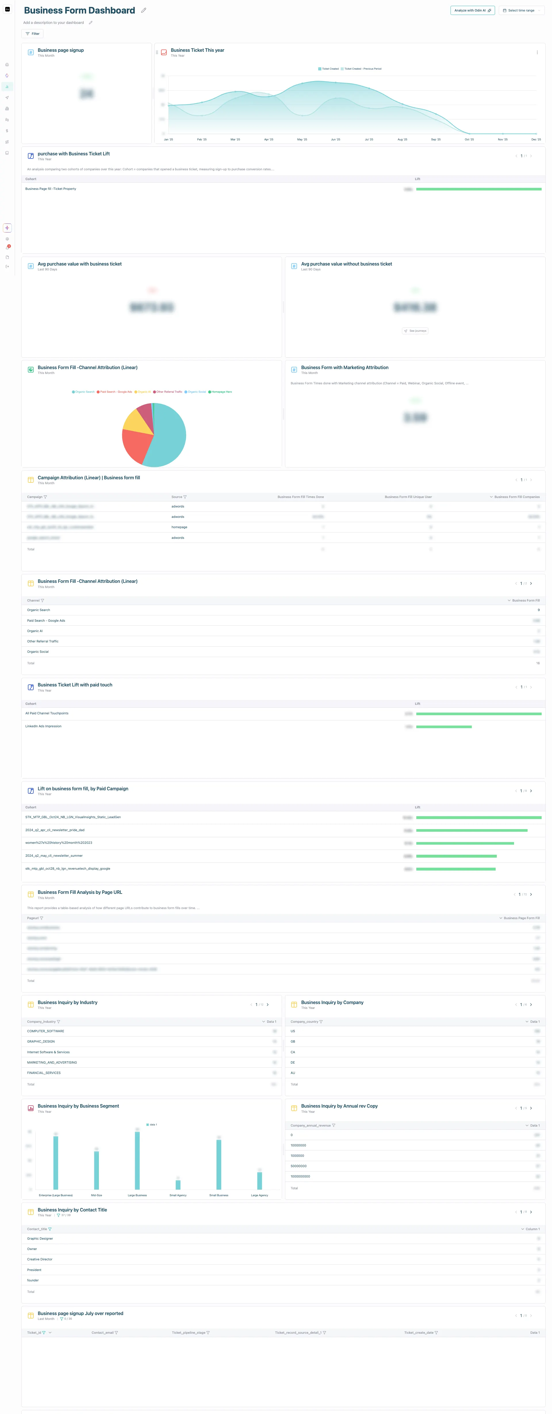 Masagi’s Enterprise Pipeline Dashboard is designed to measure the enterprise business form submissions that come inbound, their sources, and how they translate to revenue. Here’s what it measures, across different sections (metrics anonymized for privacy):